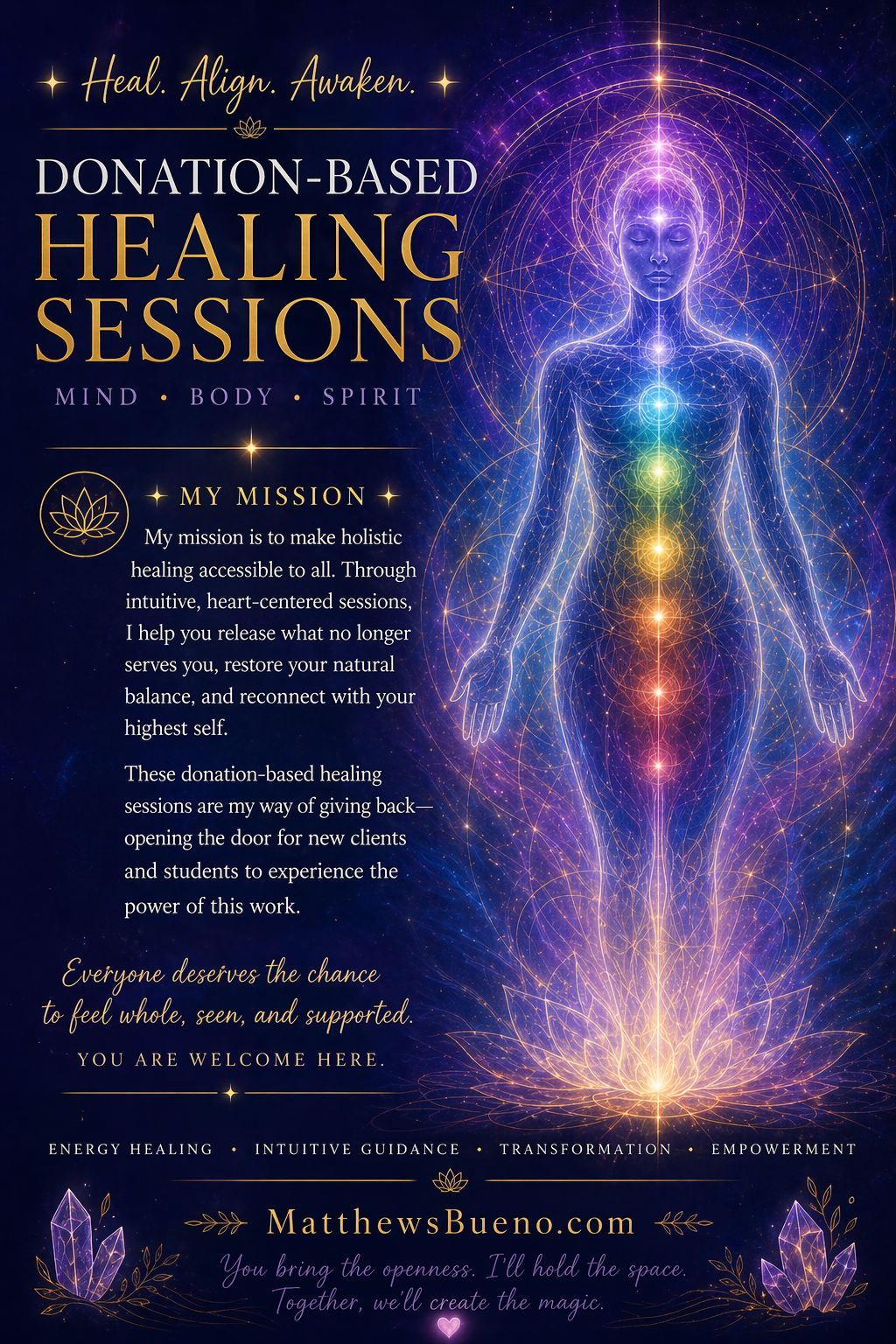 “These donation-based sessions are an invitation to be seen, felt, and awakened. My mission is to help you reconnect with the deeper parts of yourself—activating your inner guidance so your healing continues long after our time together.”